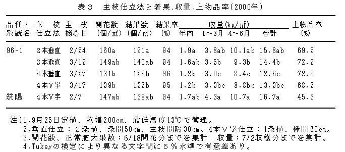 表3 主枝仕立法と着果、収量、上物品率(2000年)