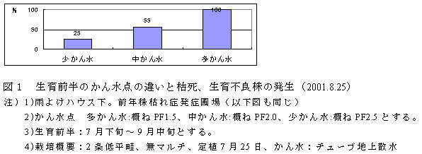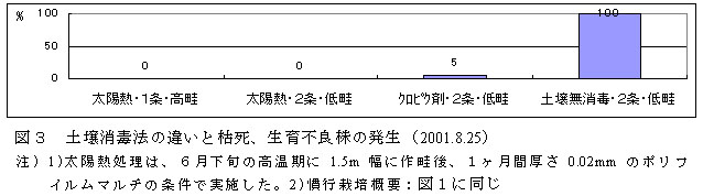 図3 土壌消毒法の違いと枯死、生育不良株の発生(2001.8.25)