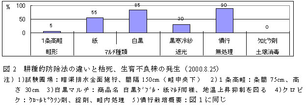 図2 耕種的防除法の違いと枯死、生育不良株の発生(2000.8.25)