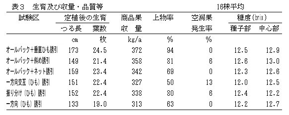 生育は、「オールバック+垂直ひも誘引」が最も優れる(表2)。