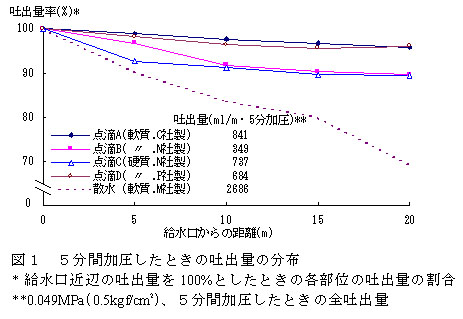 点滴チューブは、単位時間当たりの吐出量が少なく、チューブ長20mでの給水口部と末端部の吐出量の差も5〜10%程度にとどまる(図1)。
