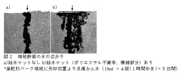 底面給水マット(ポリエステル不織布)を培地の表面に敷いて点滴かん水を行うと、培地の広い範囲に水が拡散する(図2)。