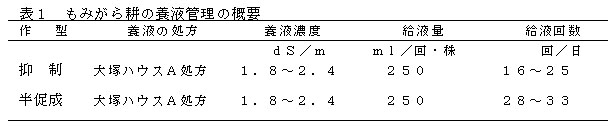 表1に示すとおり、抑制、半促成作型とも、養液は大塚ハウスA処方とし、濃度を1.8〜2.4dS/mに設定し、タイマー制御で給液を行う。