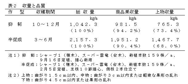 生育は順調で障害もなく、抑制栽培では、3ヵ月間で商品果収量約980kg/a、半促成栽培では、4ヵ月間で商品果収量約1,950kg/aが得られる(表2)。