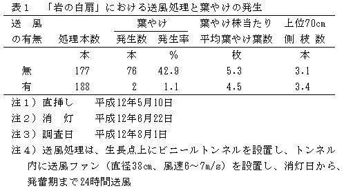 表1 「岩の白扇」における送風処理と葉やけの発生