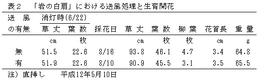 「岩の白扇」は、消灯日より発蕾まで終日、生長点付近に微風を送風することによって葉やけを防止できる(表1)。