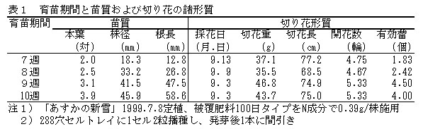 288穴セルトレイに播種後9週で根鉢が形成され、本葉3対程度の苗となる。10週育苗では節間伸長が始まり徒長苗となる。9週育苗までは育苗期間が長いほど開花が早く、9週と10週育苗の間に差は認められない。切り花長は7週育苗が最も長くなるが、切り花重、花蕾数は9週育苗が優れる(表1)。
