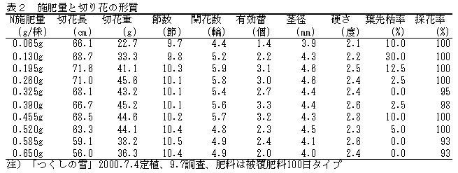 N成分で株当り0.195gまでは施肥量の増加に伴い切り花長が長くなり、逆に0.260g以上では切り花長が短くなる傾向が見られる。また、切り花重は0.260g〜0.520gが重く、花蕾数は0.195g〜0.455gが多い(表2)。