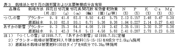 プランター栽培に比べ底面給水栽培では、乾物重が重く、P含有率が高く、Ca含有率が低い。他の無機成分の含有率の差は少ない。また、切り花重、切り花長、開花数等の切り花形質は底面給水栽培がプランター栽培より優れ、晩生の「つくしの雪」では底面給水栽培により高温期の作型でも十分な切り花形質が得られる(表3)。