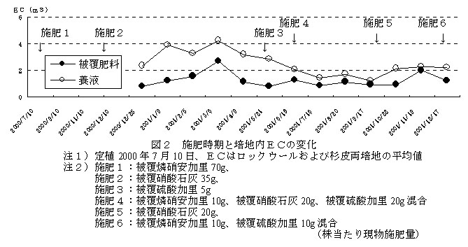 被覆肥料を組み合わせて施用すると、培地内ECは0.8〜1.9mSで、養液栽培に比べ低く推移するが、生育に差は認められない(図2)。