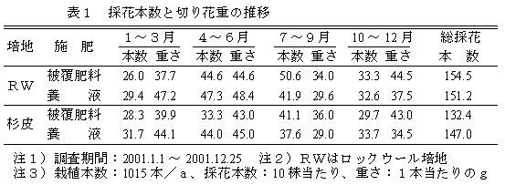 採花本数は、被覆肥料施用の杉皮培地でやや少ないものの、養液栽培に比べ大差ない。切り花重は、被覆肥料を組み合わせた施肥体系にして以降重くなり、切り花品質の向上が認められる(表1)。