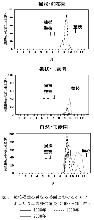 煎茶園(弧状仕立て)のデータは、二番茶まで摘採したもので、三番茶まで摘採する体系では、新芽(翌年の一番茶の母葉)の生育期がチャノホコリダニの発生と一致するため、防除が必要である。