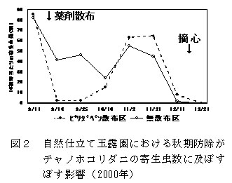 図2 自然仕立て玉露園における秋期防除がチャノホコリダニの寄生虫数に及ぼすぼす影響(2000年)