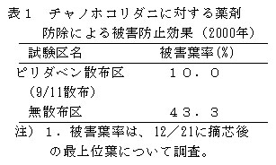 表1 チャノホコリダニに対する薬剤防除による被害防止効果(2000年)