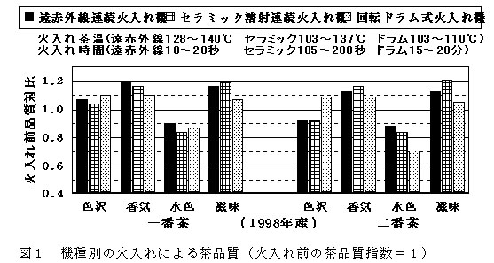 火入れ後の茶品質は、回転ドラム式火入れ機に比べ、遠赤外線連続火入れ機及びセラミック溶射連続式火入れ機が優れる(図1)。