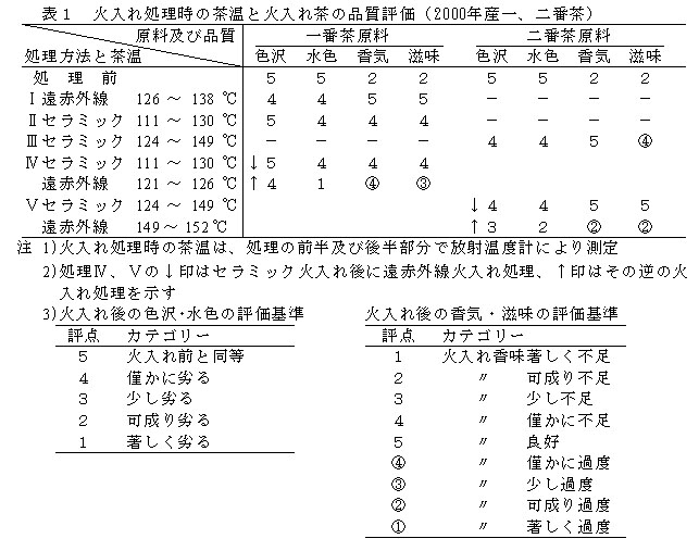 表1 火入れ処理時の茶温と火入れ茶の品質評価(2000年産一、二番茶)