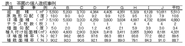 個人施工によるテラス式茶園の造成後の畑面勾配は1.2度から5.9度の範囲にあり、乗用型管理機の利用が十分可能である。整備後の平均圃場面積率は、原地形の89.6%である。さらに、旋回枕地を兼ねた耕作道等以外の平均植栽面積率は、圃場面積の88.7%である(表1)。
