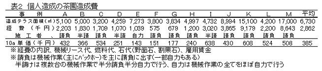 個人施工による茶園の造成経費は、原地形の形状や法面処理法、作業請負の形態等により格差があり、機械代や雇用賃金などの直接支払経費は10a当たり15万〜64万円で、平均38万円5千円である(表2)。