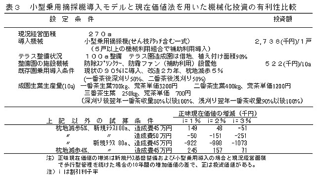 表3 小型乗用摘採機導入モデルと現在価値法を用いた機械化投資の有利性比較