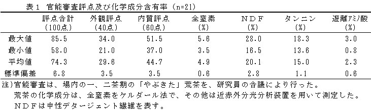 審査評点合計を目的変数、主要化学成分含有率を説明変数とした重回帰分析(変数増減法によりF値を2に設定)では、全窒素及びタンニン含有率が説明変数として有効であり、審査評点合計は次式で推定できる。