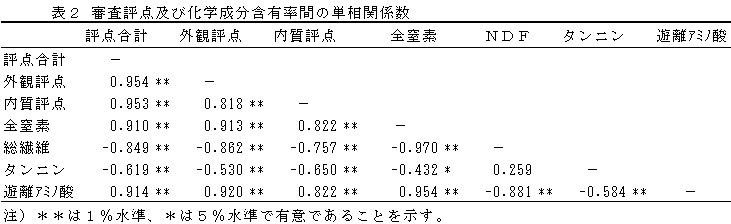 むし製玉緑茶の官能審査評点に対し、全窒素及び遊離アミノ酸含有率は正、総繊維及びタンニン含有率は負の有意な相関が認められる(表1、表2)。