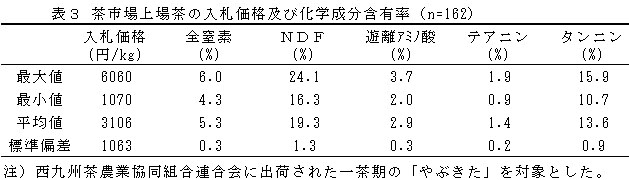 表3 茶市場上場茶の入札価格及び化学成分含有率(n=162)