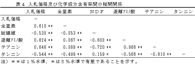 入札価格に対し、全窒素、遊離アミノ酸及びテアニン含有率は正、総繊維及びタンニン含有率は負の有意な相関が認められる(表3、表4)。