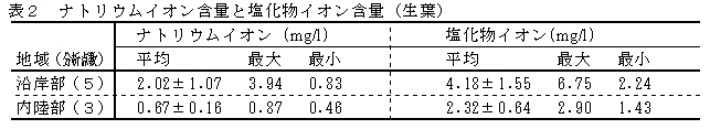 表2 ナトリウムイオン含量と塩化物イオン含量(生葉)