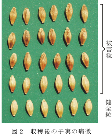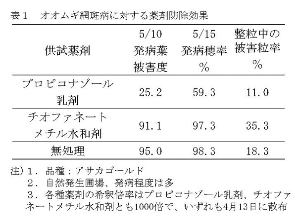 防除:出穂期にプロピコナゾール乳剤を散布すると穂の発病が抑制される(表1)。