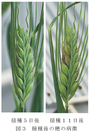 分離菌株の病原性:穂から分離した菌株を用いて分生子を形成させ、出穂直後の穂に接種すると、5日後頃から病斑が形成される(図3)。また、葉に接種すると、褐色網目状の典型的な網斑病の病斑が形成される。葉から分離された網斑病菌による接種試験でも同様な病斑が形成される。