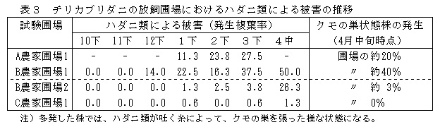 表3 チリカブリダニの放飼圃場におけるハダニ類による被害の推移