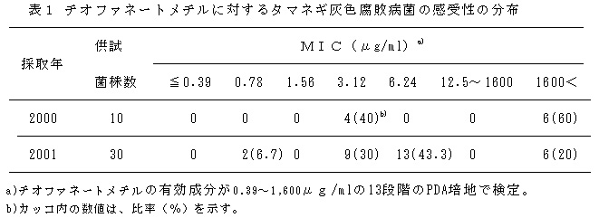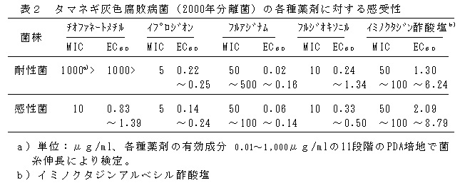 表2 タマネギ灰色腐敗病菌(2000年分離菌)の各種薬剤に対する感受性
