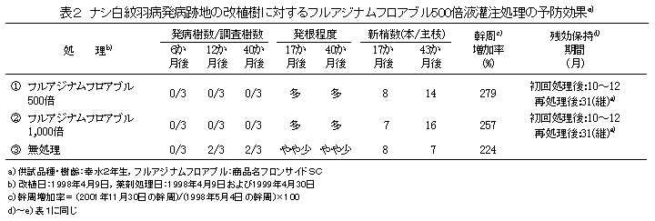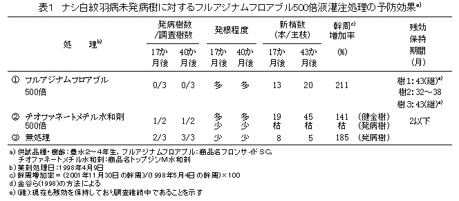 表1 ナシ白紋羽病未発病樹に対するフルアジナムフロアブル500倍液灌注処理の予防効果a)