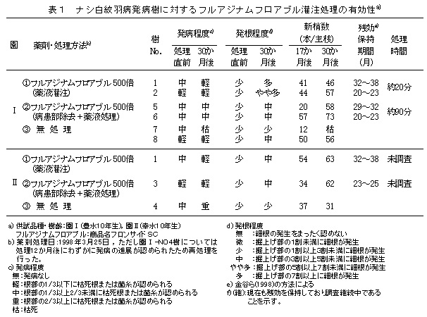 表1 ナシ白紋羽病発病樹に対するフルアジナムフロアブル灌注処理の有効性a)