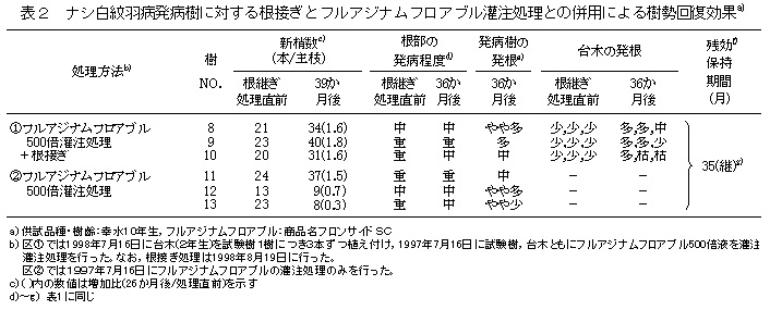 表2 ナシ白紋羽病発病樹に対する根接ぎとフルアジナムフロアブル灌注処理との併用による樹勢回復効果a)