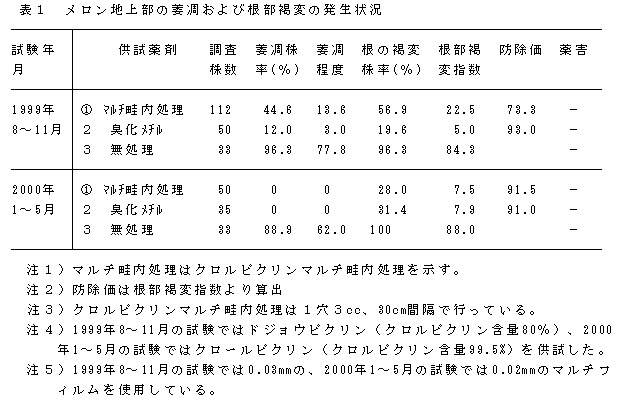 表1 メロン地上部の萎凋および根部褐変の発生状況