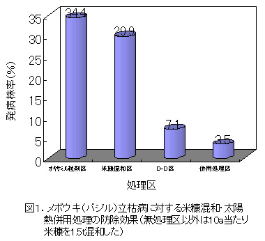 図1 メボウキ立枯病に対する米糠混和・太陽熱併用処理の防除効果