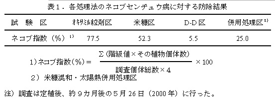 表1 各処理法のネコブセンチュウ病に対する防除結果