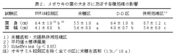 葉の大きさは、米糠混和区、併用処理区で有意差が認められた。併用処理区では葉が長・幅とも大きくなったが米糠単独区では逆に小さくなった(表2)。葉の大きさは両処理を組み合わせることで大きくなったことから肥培効果の面からも有効である。
