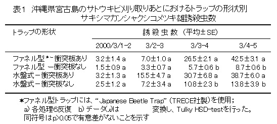 表1 沖縄県宮古島のサトウキビ刈りあとにおけるトラップの形状別サキシマカンシャクシコメツキ雄誘殺虫数