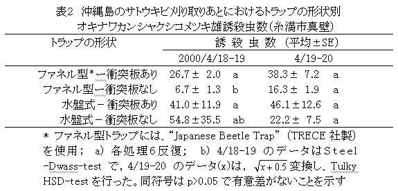 表2 沖縄島のサトウキビ刈り取りあとにおけるトラップの形状別オキナワカンシャクシコメツキ雄誘殺虫数(糸満市真壁)