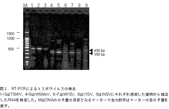 感染の疑われる植物からCF11ニトロセルロースを用いて抽出したRNAを鋳型として上記プライマーを用いて表1に示す手順にて反応させることで、トマト黄化えそウイルス(TSWV)、インパチェンスネクロティックスポットウイルス(INSV)からは450bpの大きさのDNA断片が増幅され、メロン黄化えそウイルス(MYSV)およびスイカ灰白色斑紋ウイルス(WSMoV)、Iris yellow spot virus(IYSV;和名未定)からは350bpの大きさのDNA断片が増幅される(図1)。