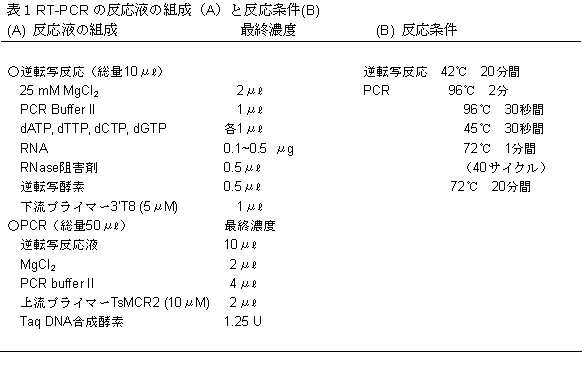 表1 RT-PCRの反応液の組成(A)と反応条件(B)