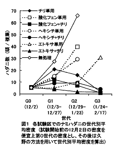 12月2日を有効積算温度の起算日とした場合、ナミハダニの第1、第2、第3世代の出現日はそれぞれ12月3日〜12月28日、12月29日〜1月23日、1月24日〜2月17日となった(図1)。選択的殺ダニ剤単用区では、ハダニの初期発生を無処理区に比べて抑制した。しかし、酸化フェンブタスズおよびヘキシチアゾクス単用区では第2世代、エトキサゾ−ル単用区では第3世代の発生を抑制できなかった(図1)。