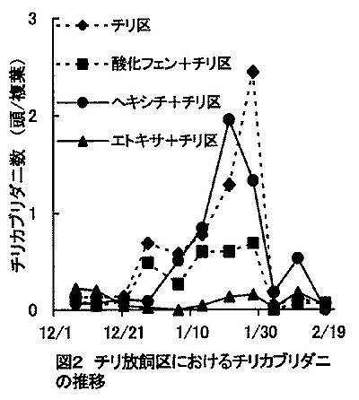 - ナミハダニの中〜多発生時(数頭以上/1複葉)にチリカブリダニを用いる場合は、酸化フェンブタスズ、ヘキシチアゾクス、エトキサゾ−ルを散布し、その翌日にチリカブリダニの放飼を行うと、ナミハダニ低密度時のチリカブリダニ放飼と同様に高い防除効果が得られる。