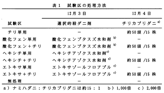 以上のことから、上記3種の選択的殺ダニ剤を散布した翌日にチリカブリダニを放飼する体系は、速効的な効果が得られ、しかもチリカブリダニが定着することで長期間の効果が期待できる。