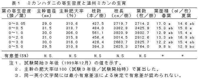 表1 ミカンハダニの寄生密度と温州ミカンの生育