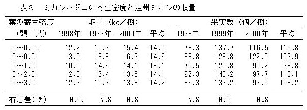 表3 ミカンハダニの寄生密度と温州ミカンの収量