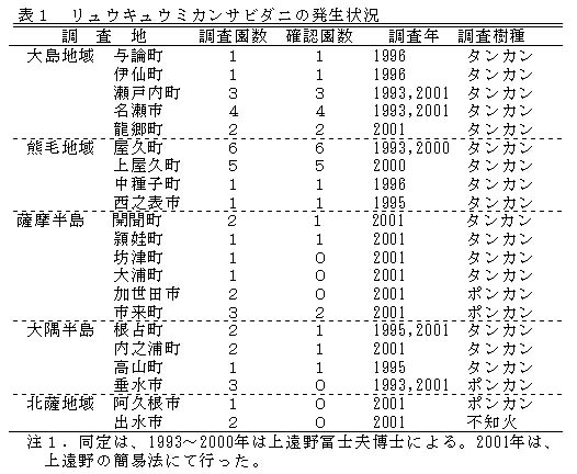 大島地域(与論町、伊仙町、名瀬市、瀬戸内町、龍郷町)、熊毛地域(上屋久町、屋久町、西之表市、中種子町)、薩摩半島(開聞町、枕崎市、市来町)、大隅半島(内之浦町、高山町、根占町)でリュウキュウミカンサビダニの発生が認められる(表1)。