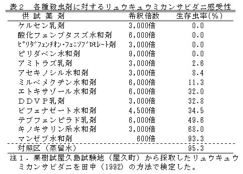 表2 各種殺虫剤に対するリュウキュウミカンサビダニ感受性